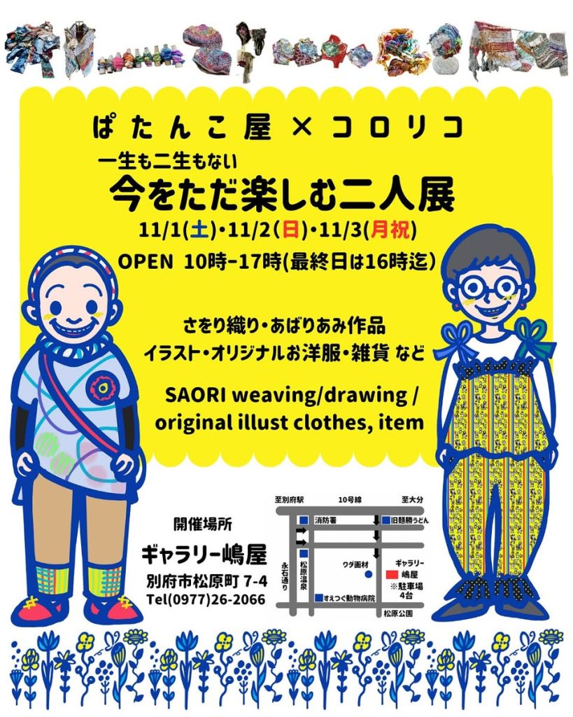 11月1、2、3は大好きな「コロリコ」さんとの2人展です新しく生まれ変わったギャラリー嶋屋さんあたしは2024年4月にここで展示会をさせていただきました店主が最高に優しくて明るく別府の街が好きになったのですあたしの宿はいつもの「茶吉」ゲストハウスですここのママも大好きなんです朝は「カフェ」ピリカ夜は放浪酒場やナチュラルワインのお店とかいろいろ行くとこが多くて困ります今回はギャラリーの2会場でそれぞれの展示が展開されます個展が二つあるとお考えくださいそれから「松原温泉」は多分あたしは毎日入ると思われますここのお風呂も大好きです^^タオル片手ね^^では11月1、2、3は別府でね^^ギャラリー嶋屋0977−26−206610時から17時最終日16時大分県別府市松原町7ー4P有りついにあの大分で密かに人気だったー^^古着屋「コロリコ」のオーナーの「モナ」さんと展示会ですコロリコは閉店でも私は「モナ」さんと展示会がしたーいしたーいといことで実現11月1、2、3の3日間コロリコさんとぱたんこ屋の2人展開催別府のギャラリー嶋屋さんにてここのギャラリーのオーナーがこれまたいいんだわ彼女大好きで空間的に私は「コロリコ」さん的な世界観が見たいのでギャラリー入り口右の個室「通路に面しています」なんとそこが「コロリコさん」の世界になる3日間コロリコさんのファンの方お見逃しなくぱたんこ屋はさをり織りのお洋服やまたまた「絵」なんかも飾ってしまおうかと妄想中別府市松原町7−4ギャラリー嶋屋0977−26−206610時から17時最終日はお片付けもあるので16時作家さんで展示会場お探しの方にもおすすめオーナーは全力で応援してくださいます「コロリコさん」の作品は何がその時にできてるかワクワクして待ちましょうお帰りは松原温泉「おすすめでーす」多分私は毎日展示会終われば入浴してるでしょうなんてね別府の街は楽しい町です遠方から来られる方も楽しめますどうぞお会いできるのをワクワクしてお待ちしますねコロリコさんとぱたんこ屋に出会ってください 表