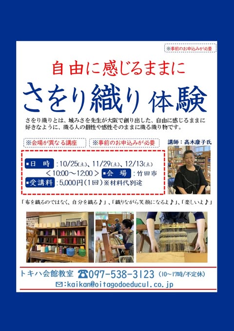 oita_godo_bunka【現地で体験!】——————————–「さをり織り」に挑戦しませんか?——————————– 講師:髙木康子 氏——————————–・自由に感じるままに♪・布を織るのではなく、自分を織る♪・織りながら笑顔になるよ♪・楽しいよ♪——————————– **【事前予約が必要】**————————————–