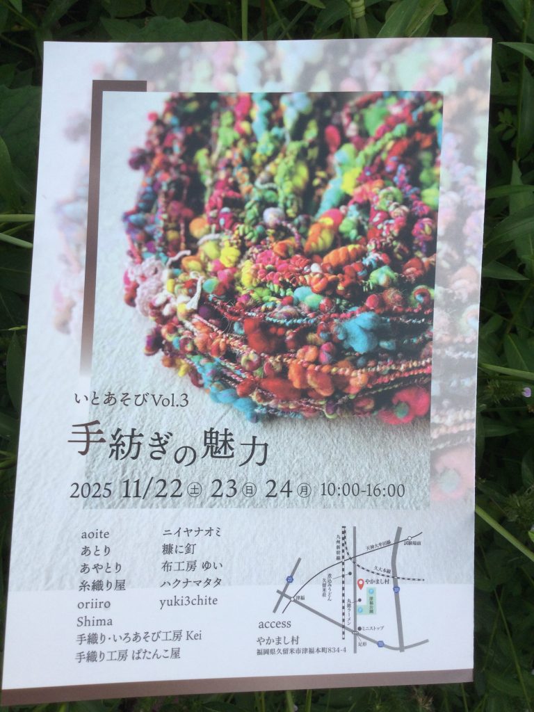 お店ではお目にかかれない個性的な糸を中心にストールや洋服、小物がズラリと並びます人気のワークショップもあります!どんな作品が届くのか今から(っ’ヮ’c)ワクワク届き次第、撮影して作家さん紹介していくのでそちらもお楽しみに♡.いとあそびvol.3 「手紡ぎの魅力」━━━━━━━━━━━━━━━━━━場所 やかまし村のギャラリー 福岡県久留米市津福本町834-4日時 11/22(土)-11/24(月) 10:00-16:00━━━━━━━━━━━━━━━━━━#手紡ぎの魅力#アートヤーン#ワークショップ