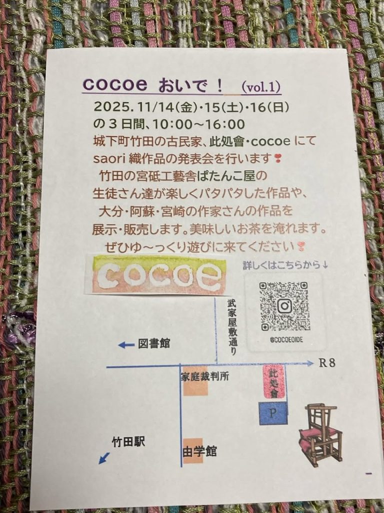 最後は神頼み竹田にある素敵な「古民家」cocoeが11月にオープンしますまずは不定期の「イベントハウス」です11月14、15、16「金」「土」「日」の3日間です初のイベントは「さをり織りやアートヤーンや布小物」の展示会を企画しますお店の代表は「北淳」さんですhttps://www.facebook.com/sunao.kita.3cocoe]ありがたいことにたくさんの応募ありがとうございましたー^^参加の方は集まりましたので募集は打ち切りますあとは当日の出会いをお待ちしていますね竹田でcocoeおいでー^^ぱたんこ屋はイベントページ作成のお手伝いです初の開催ですが「cocoe」は大分県竹田の武家屋敷の近くの本当に素敵な住居でありますここで何かできないかなー^^したいなー^^ということで彼女はお茶でも飲みながら交流できたらいいなと考えています駅から歩いて10分から15分車も5、6台は止められます街中の有料Pに停めても5、6分です布小物さをり織りアートヤーン作られてる方「糸」「布」関係のものを今回は展示したいと考えています10時から16時素敵な作品も購入くださいそばには観光地ですからいろいろな素敵な場所がありますお店もありますここが竹田の新しい「場に」なればと思うのですきっと楽しいイベントになると思うのですぱたんこ屋は当日13、14、15、16宮砥工藝舎10時から15時オープン「あやとりさんの糸販売会をしていますどうぞそちらもおいでください「北淳」さんにメッセージで場所はお問合せください「彼女は機織り教室の生徒さんです」当日彼女や「花」ちゃんの作品も並べたらいいなー^^と思う高木ですよろしくねー^^出会いはcocoe「北淳」さんのFBhttps://www.facebook.com/sunao.kita.3インスタhttps://www.instagram.com/sunapy4/?hl=jaここで出会うという意味のcocoe