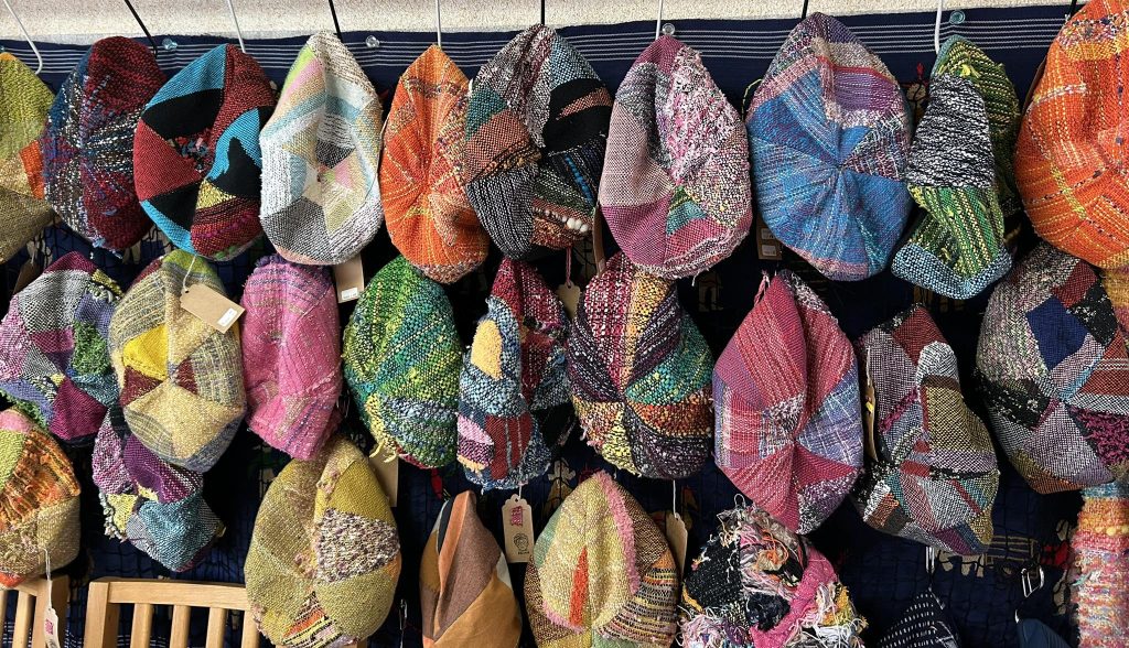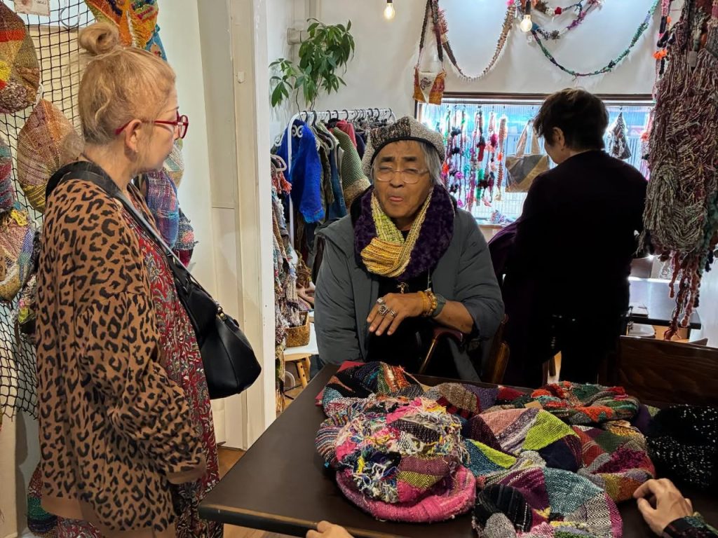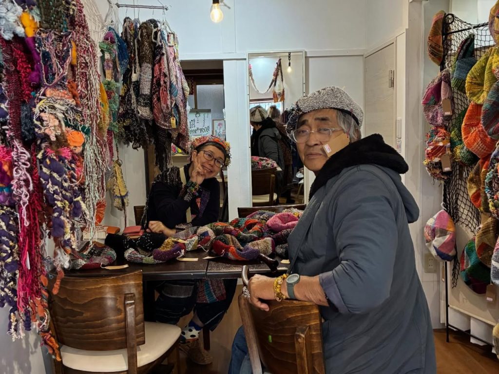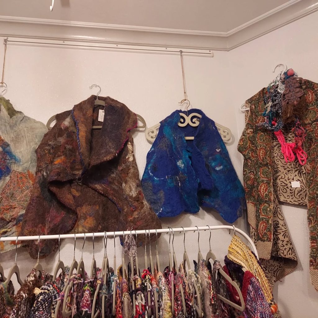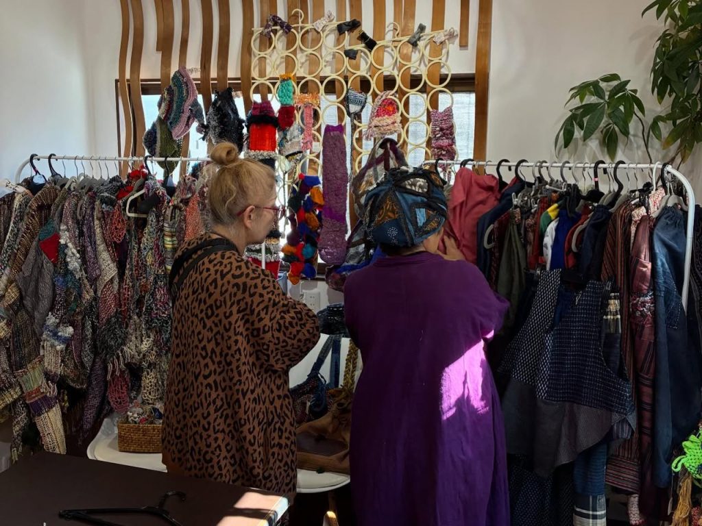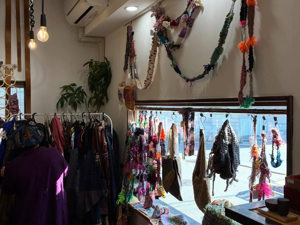 ぜひどんどん試着してください。『草花咲咲』のオーナー米山由美さんはアパレル業界でデザイナー、パタンナーの経験者。おしゃれの達人です!中国茶もぜひぜひ楽しんでください