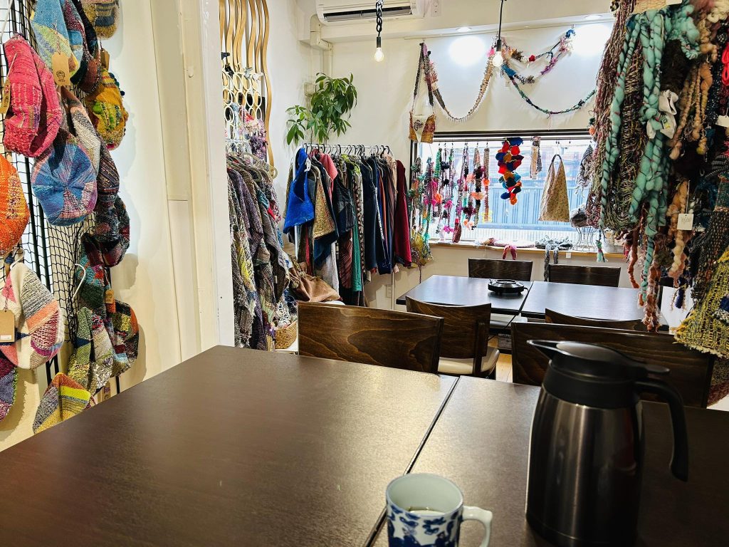 ぜひどんどん試着してください。『草花咲咲』のオーナー米山由美さんはアパレル業界でデザイナー、パタンナーの経験者。おしゃれの達人です!中国茶もぜひぜひ楽しんでください
