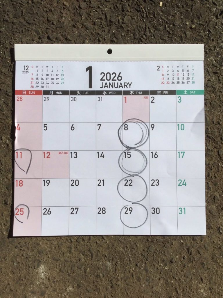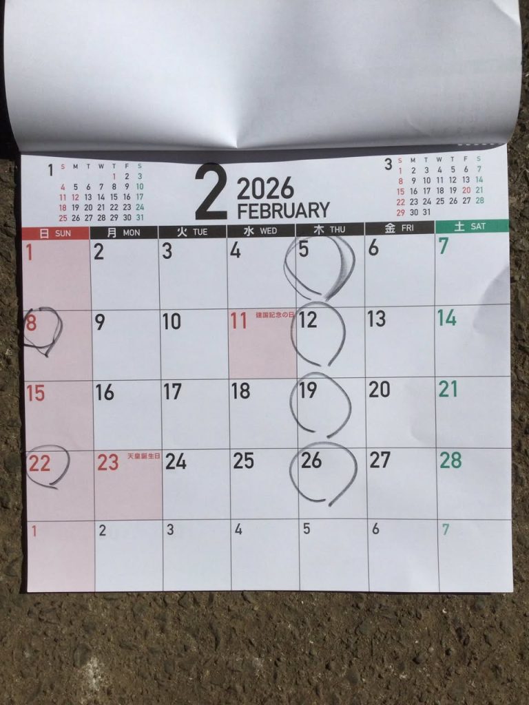 予定変更 投稿日: 2025年12月6日2025年12月6日by patancoya 12月予定変更7-11-18-21-25予約ありまーすのでオープン冬は1月2月この様な予定にします予約なければおやすみです3月から多めにオープンしますので少し我慢よろしくお願いします宮砥工藝舎 いつも応援ありがとうございます
