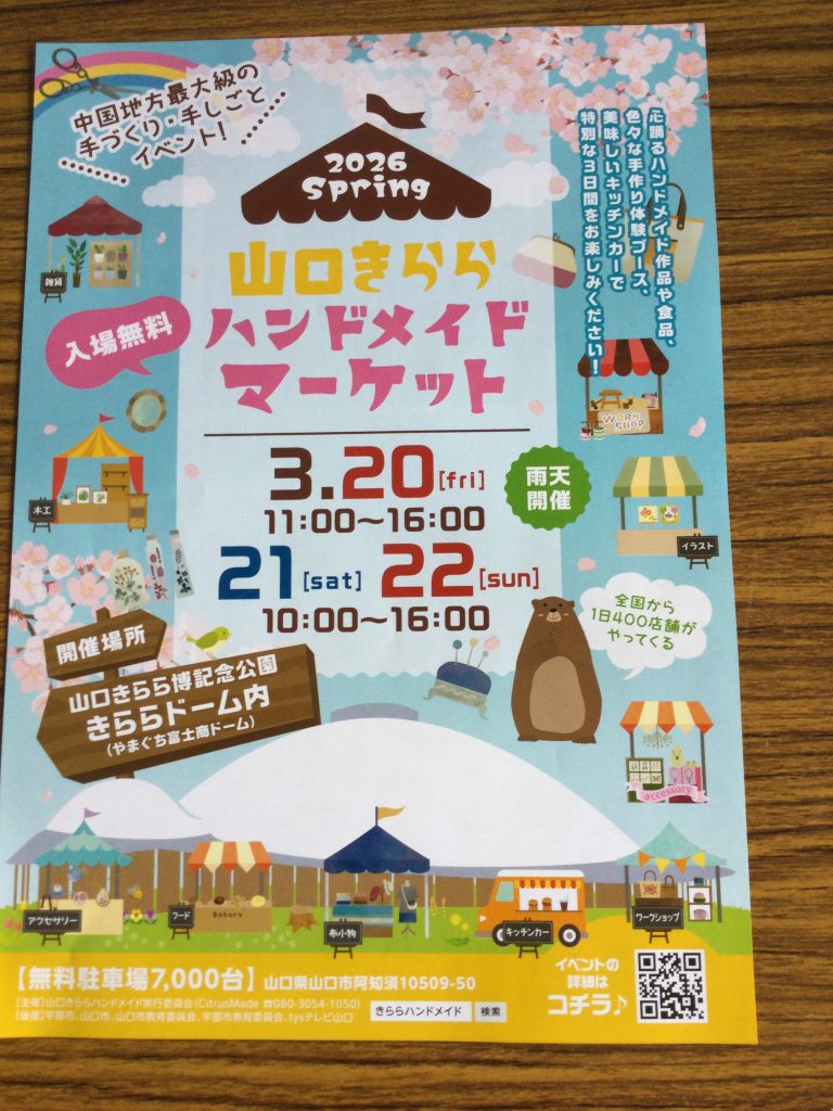 人生初の山口 投稿日: 2026年3月18日2026年3月18日by patancoya 2026年春山口きららハンドメイドマーケット初めてでます3月20、21、2211時から16時ぱたんこ屋大分から行きます山口市阿知須10509−50山口きらら博記念公演きららドーム内やまぐち富士商ドームさをり織りあばりあみ布服小物色々持って行きまーす期間中お会いできるのを楽しみにしております^^場所決まるS05252番です見つけてね^^Sです いつも応援ありがとうございます